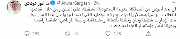 وكتب في تغريدة عبر "تويتر" رصدها "المشهد العربي": "لن نجد أحرص من المملكة العربية السعودية الشقيقة على اليمن ومن خلال قيادتها للتحالف سياسيا وعسكريا ندرك روح المسؤولية التي تضطلع بها في هذا الشأن، ولن تجد الإمارات شقيقا وجارا وحليفا بأصالة ومصداقية وحمية الرياض، علاقتنا راسخة ورؤيتنا لأمن واستقرار المنطقة واحدة".