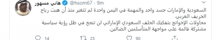 وكتب في تغريدة عبر "تويتر" رصدها "المشهد العربي": "السعودية والإمارات جسد واحد والمهمة في اليمن واحدة لم تتغير منذ أن هبت رياح الخريف العربي".