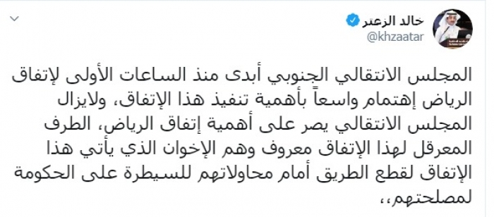 وكتب الزعتر عبر تغريدة له على "تويتر" رصدها " المشهد العربي":"المجلس الانتقالي الجنوبي أبدى منذ الساعات الأولى لاتفاق الرياض اهتماما واسعاً بأهمية تنفيذ هذا الاتفاق، ولا يزال المجلس الانتقالي يصر على أهمية اتفاق الرياض".