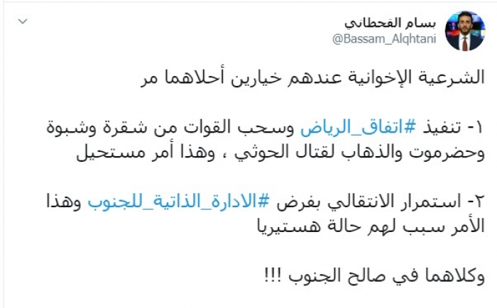 وكتب القحطاني عبر تغريدة له على "تويتر" رصدها " المشهد العربي":"الشرعية الإخوانية عندهم خيارين أحلاهما مر".