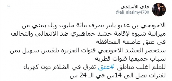 وكتب الأسلمي عبر تغريدة له على "تويتر" رصدها " المشهد العربي":"الاخونجي بن عديو يأمر بصرف مائة مليون ريال يمني من ميزانية شبوة لإقامة حشد جماهيري ضد الانتقالي والتحالف في عتق عاصمة المحافظة".