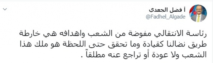 وكتب الجعدي عبر تغريدة له على "تويتر" رصدها " المشهد العربي":"رئاسة الانتقالي مفوضة من الشعب وأهدافه هي خارطة طريق نضالنا كقيادة وما تحقق حتى اللحظة هو ملك هذا الشعب ولا عودة أو تراجع عنه مطلقاً" .