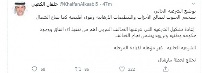 وأضاف: "إعادة تشكيل الشرعية التي شرعنها التحالف العربي أهم من تنفيذ أي اتفاق ووجود حكومة وطنية ونزيهة يضمن نجاح التحالف ؛ الشرعية الحالية غير مؤهلة لقيادة المرحلة نحتاج لخطة مارشال".