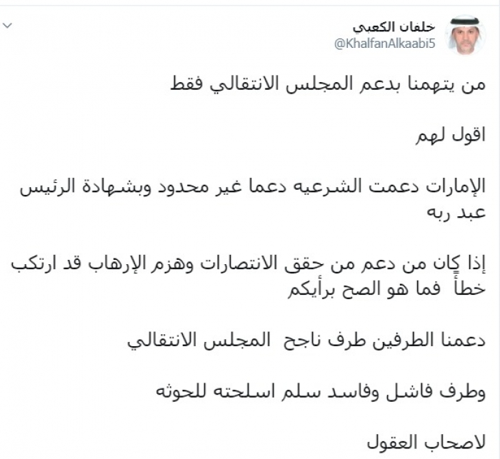 وكتب الكعبي عبر تغريدة له على "تويتر" رصدها " المشهد العربي":"من يتهمنا بدعم المجلس الانتقالي فقط، أقول لهم الإمارات دعمت الشرعية دعما غير محدود وبشهادة الرئيس عبدربه".