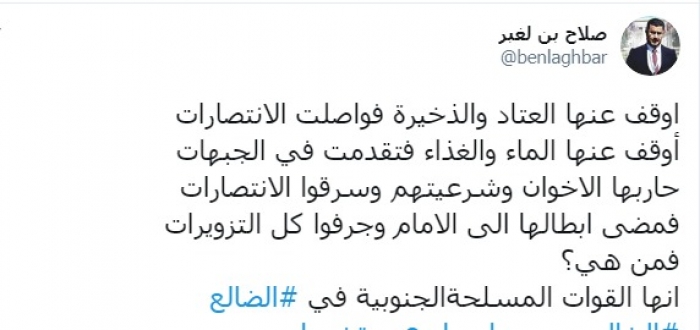 أشاد الإعلامي صلاح بن لغبر، اليوم الثلاثاء، بالقوات المسلحة الجنوبية في الضالع بسبب انتصاراتها المتتالية بجبهات القتال.