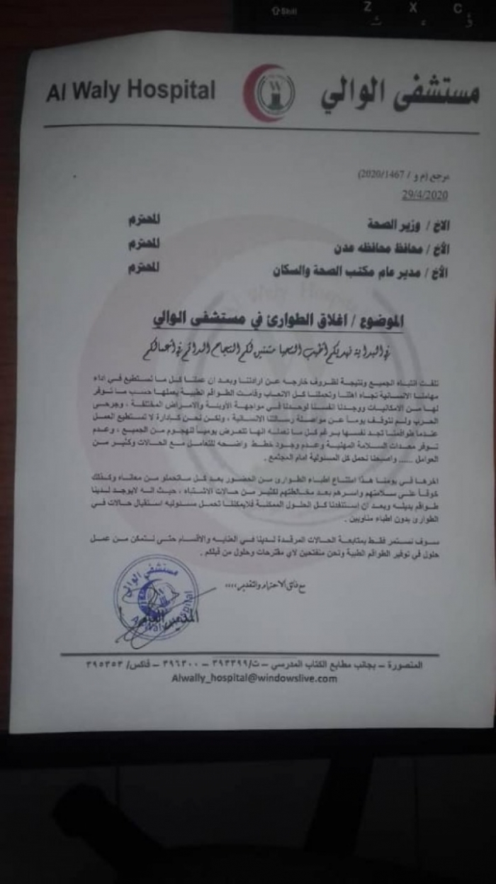مستشفى الوالي بعدن يغلق أبوابه.. ويوضح السبب