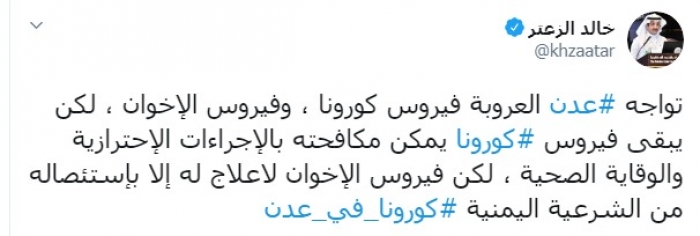 وكتب الزعتر عبر تغريدة له على "تويتر" رصدها " المشهد العربي":"تواجه عدن العروبة فيروس كورونا ، وفيروس الإخوان ".