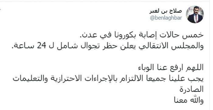 وكتب بن لغبر عبر تغريدة له على "تويتر" رصدها " المشهد العربي":"خمس حالات إصابة بكورونا في عدن، والمجلس الانتقالي يعلن حظر تجوال شامل لـ 24 ساعة".