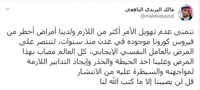 وكتب اليافعي عبر تغريدة له على "تويتر" رصدها " المشهد العربي":"نتمنى عدم تهويل الأمر أكثر من اللازم ولدينا أمراض أخطر من فيروس كورونا موجودة في عدن منذ سنوات".