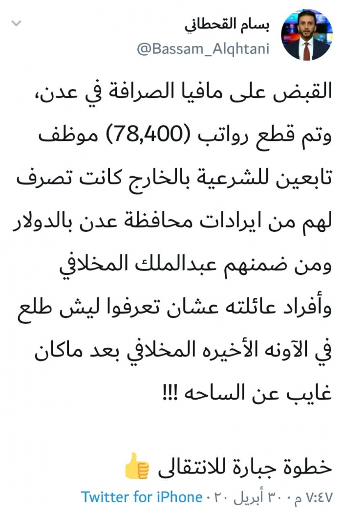 وكتب "القحطاني" في تغريدك عبر حسابه الشخصي بتويتر، رصدها "المشهد العربي": "القبض على مافيا الصرافة في عدن، وتم قطع رواتب (78,400) موظف تابعين للشرعية بالخارج كانت تصرف لهم من إيرادات محافظة عدن بالدولار ومن ضمنهم عبدالملك المخلافي وأفراد عائلته".