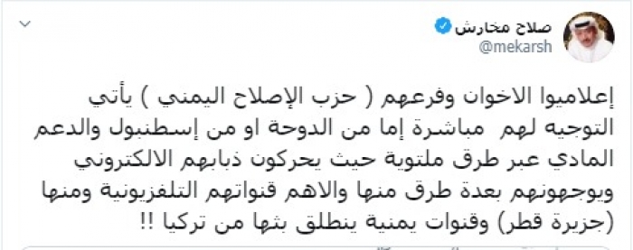 وكتب "مخارش" في تغريدة عبر حسابه بتويتر، رصدها "المشهد العربي" قال فيها: "إعلاميو الإخوان وفرعهم ( حزب الإصلاح اليمني ) يأتي التوجيه لهم مباشرة إما من الدوحة أو من إسطنبول والدعم المادي عبر طرق ملتوية حيث يحركون ذبابهم الإلكتروني ويوجهونهم بعدة طرق منها والأهم قنواتهم التلفزيونية ومنها (جزيرة قطر) وقنوات يمنية ينطلق بثها من تركيا".