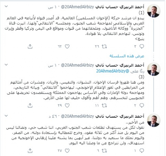 "ومن هنا ظهروا فرسان الإخوان، النشوان، والنفيس، والريان، وعشرات من أمثالهم من المرابطين في ثغور الإعلام الإخونجي، ليهاجموا "الانتقالي" وبيانه التاريخي، ومهاجمة دولة الإمارات وفي الأساس يهاجمون المملكة ويستقصدون تحريضها على الجنوبيين لتخسرهم، وهم أهم وأقوى حليف لها على الأرض".