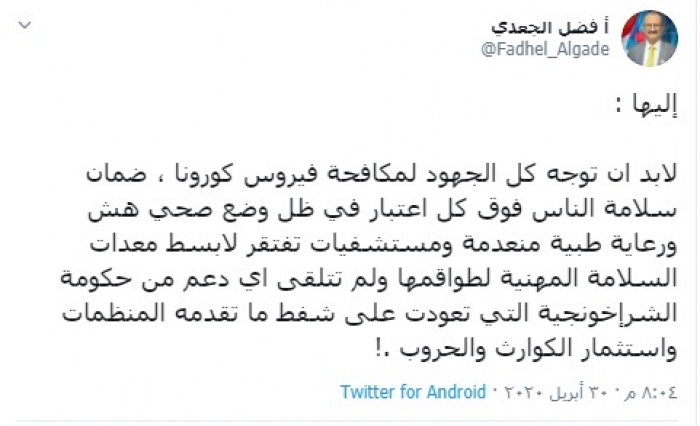 وكتب "الجعدي" في تغريدة عبر حسابه بتويتر، رصدها "المشهد العربي" قال فيها: "لابد أن توجه كل الجهود لمكافحة فيروس كورونا ، ضمان سلامة الناس فوق كل اعتبار في ظل وضع صحي هش ورعاية طبية منعدمة ومستشفيات تفتقر لأبسط معدات السلامة المهنية لطواقمها ولم تتلقى أي دعم من حكومة الشرإخونجية التي تعودت على شفط ما تقدمه المنظمات واستثمار الكوارث والحروب" .