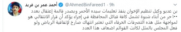 وقال في تغريدة عبر "تويتر" رصدها "المشهد العربي": "بن عديو وكيل تنظيم الإخوان ينفذ تعليمات سيده الأحمر ويصدر قائمة اعتقال بعدد 100 حر من أبناء شبوة تشمل كافة قبائل المحافظة في إجراء يؤكد أن قرار الانتقالي هو لمواجهة مثل هذه التصرفات الخرقاء التي تعتبر انتهاك صارخ لاتفاقية الرياض ولو فعل المجلس بالمثل لكانت القوائم أضعاف هذا العدد".