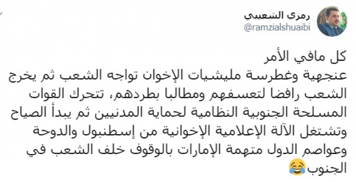 وكتب الشعيبي عبر تغريدة له على "تويتر" رصدها " المشهد العربي":"كل مافي الأمر عنجهية وغطرسة مليشيات الإخوان تواجه الشعب ثم يخرج الشعب رافضا لتعسفهم ومطالبا بطردهم".