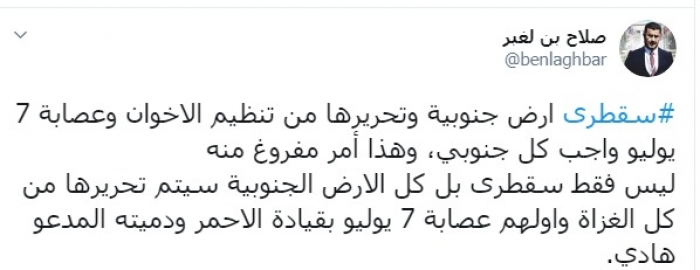 وكتب بن لغبر عبر تغربدة له على "تويتر" رصدها " المشهد العربي":"سقطرى أرض جنوبية وتحريرها من تنظيم الإخوان وعصابة 7 يوليو واجب كل جنوبي، وهذا أمر مفروغ منه".