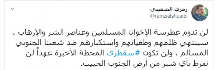 وكتب الشعيبي عبر تغريدة له على "تويتر" رصدها " المشهد العربي":"لن تدوم غطرسة الإخوان المسلمين وعناصر الشر والإرهاب ، سينتهي ظلمهم وطغيانهم واستكبارهم ضد شعبنا الجنوبي المسالم ".