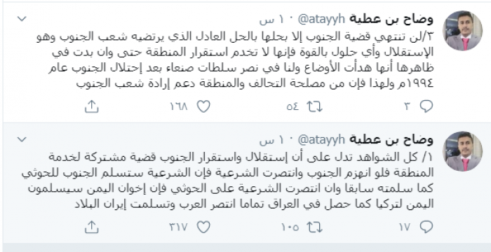وكتب بن عطية عبر تغريدة له على "تويتر" رصدها " المشهد العربي":"كل الشواهد تدل على أن استقلال واستقرار الجنوب قضية مشتركة لخدمة المنطقة".