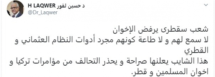 وقال في تغريدة عبر "تويتر" رصدها "المشهد العربي": "شعب سقطرى يرفض الإخوان لا سمع لهم ولا طاعة كونهم مجرد أدوات للنظام العثماني والقطري".