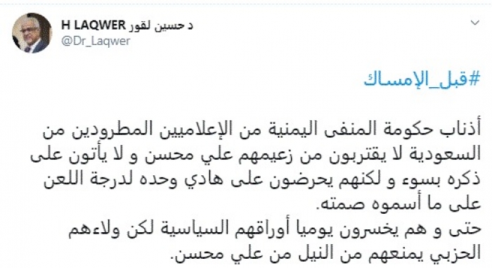 وقال في تغريدة عبر "تويتر" رصدها "المشهد العربي": "أذناب حكومة المنفى اليمنية من الإعلاميين المطرودين من السعودية لا يقتربون من زعيمهم علي محسن ولا يأتون على ذكره بسوء و لكنهم يحرضون على هادي وحده لدرجة اللعن على ما أسموه صمته".