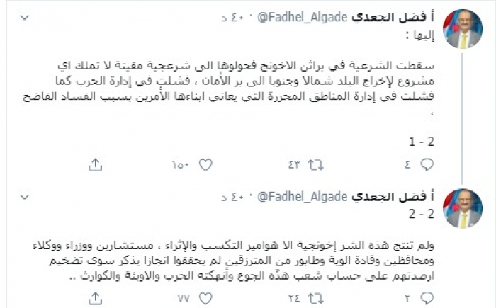 وكتب الجعدي في تغريدة نشرها عبر حسابه الرسمي في "تويتر" ورصدها "المشهد العربي": "سقطت الشرعية في براثن الإخونج فحولوها إلى شرعجية مقيتة لا تملك أي مشروع لإخراج البلد شمالا وجنوبا إلى بر الأمان ، فشلت في إدارة الحرب كما فشلت في إدارة المناطق المحررة التي يعاني أبناءها الأمرين بسبب الفساد الفاضح ".
