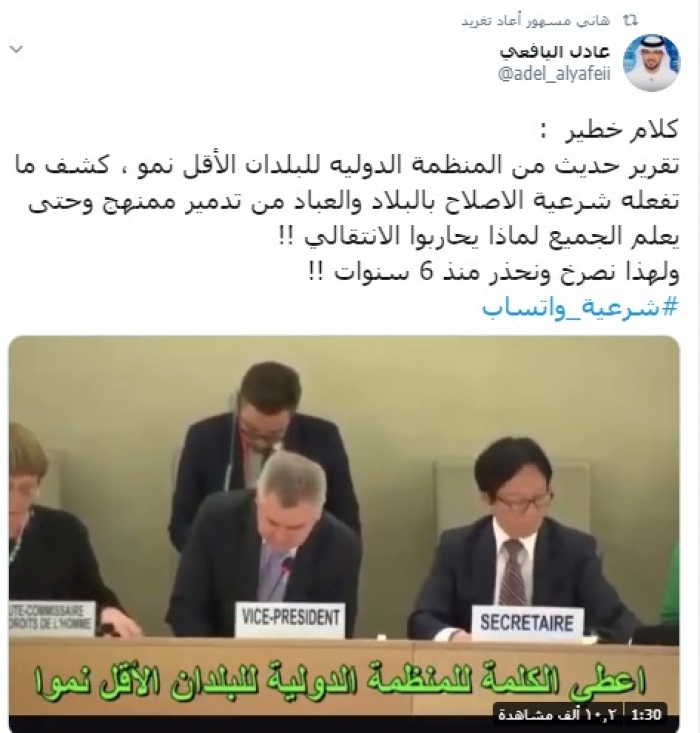 وكتب "اليافعي" في تغريدة عبر تويتر، رصدها "المشهد العربي" قال فيها: "تقرير حديث من المنظمة الدولية للبلدان الأقل نمو ، كشف ما تفعله شرعية الإصلاح بالبلاد والعباد من تدمير ممنهج وحتى يعلم الجميع لماذا يحاربوا الانتقالي".