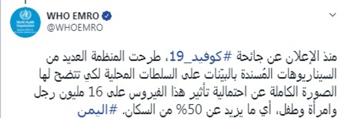 كشفت منظمة الصحة العالمية، في بيان مساء السبت، عن إبلاغ حكومة الشرعية منذ الإعلان عن جائحة كورونا، باحتمالية تأثيره على 16 مليون إنسان في البلاد.