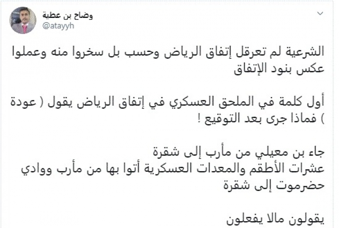 وأضاف: "أول كلمة في الملحق العسكري في اتفاق الرياض يقول (عودة) فماذا جرى بعد التوقيع! جاء بن معيلي من مأرب إلى شقرة".