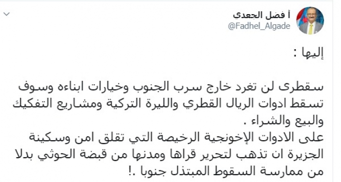 وكتب الجعدي عبر تغريدة له على "تويتر" رصدها " المشهد العربي":"سقطرى لن تغرد خارج سرب الجنوب وخيارات أبناءه وسوف تسقط أدوات الريال القطري والليرة التركية ومشاريع التفكيك والبيع والشراء" .