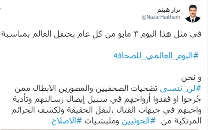 هيثم: لن ننسى شهداء وجرحى الصحفيين الذين كشفوا جرائم الحوثي و الإخوان