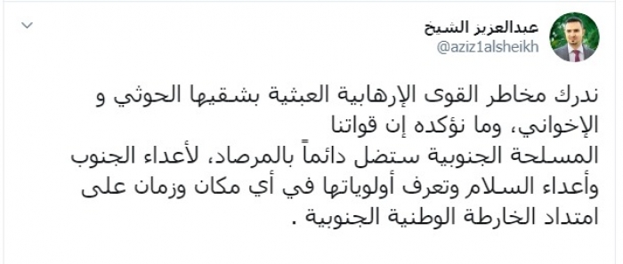 وكتب الشيخ عبر تغريدة له على "تويتر" رصدها " المشهد العربي":"ندرك مخاطر القوى الإرهابية العبثية بشقيها الحوثي و الإخواني".
