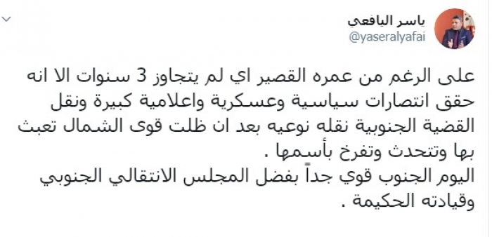 وكتب اليافعي عبر تغريدة له على "تويتر" رصدها " المشهد العربي":"على الرغم من عمره القصير إي لم يتجاوز 3 سنوات إلا انه حقق انتصارات سياسية وعسكرية وإعلامية كبيرة ونقل القضية الجنوبية نقلة نوعية بعد إن ظلت قوى الشمال تعبث بها وتتحدث وتفرخ باسمها".