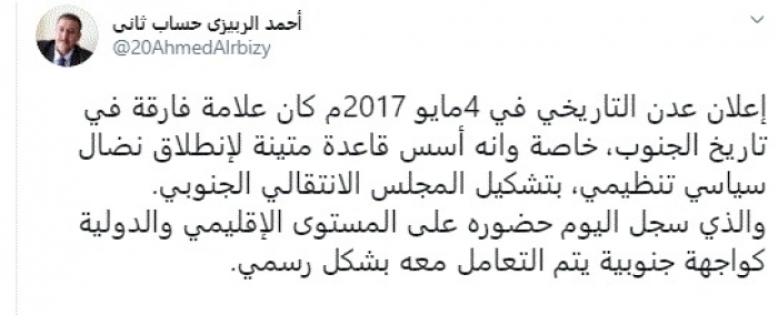 وكتب في تغريدة عبر "تويتر" رصدها "المشهد العربي": " إعلان عدن التاريخي في 4مايو 2017م كان علامة فارقة في تاريخ الجنوب، خاصة وأنه أسس قاعدة متينة لانطلاق نضال سياسي تنظيمي، بتشكيل المجلس الانتقالي الجنوبي".