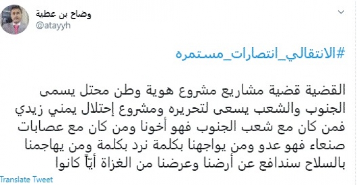 وكتب في تغريدة عبر "تويتر" رصدها "المشهد العربي": "القضية قضية مشاريع مشروع هوية وطن محتل يسمى الجنوب والشعب يسعى لتحريره ومشروع احتلال يمني زيدي فمن كان مع شعب الجنوب فهو أخونا".