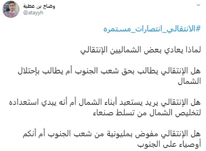 وقال في تغريدة عبر "تويتر" رصدها "المشهد العربي": "لماذا يعادي بعض الشماليين الانتقالي.. هل الانتقالي يطالب بحق شعب الجنوب أم يطالب باحتلال الشمال".