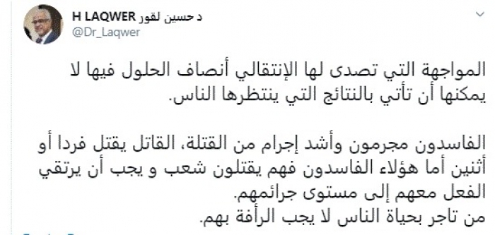 وأضاف: "الفاسدون مجرمون وأشد إجرام من القتلة، القاتل يقتل فردا أو أثنين أما هؤلاء الفاسدون فهم يقتلون شعب و يجب أن يرتقي الفعل معهم إلى مستوى جرائمهم. من تاجر بحياة الناس لا يجب الرأفة بهم".
