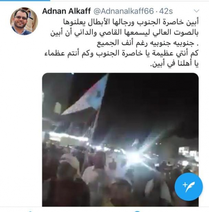 وقال في تغريدة على حسابه بموقع التواصل الاجتماعي، تويتر، إن: "أبين خاصرة الجنوب ورجالها الأبطال يعلنوها بالصوت العالي ليسمعها القاصي والداني أن أبين جنوبية".