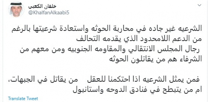 وكتب في تغريدة عبر "تويتر" رصدها "المشهد العربي": "الشرعية غير جادة في محاربة الحوثة واستعادة شرعيتها بالرغم من الدعم اللامحدود الذي يقدمه التحالف".