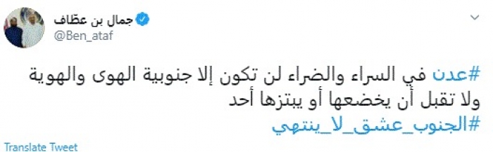 وكتب في تغريدة عبر "تويتر" رصدها "المشهد العربي": "عدن في السراء والضراء لن تكون إلا جنوبية الهوى والهوية ولا تقبل أن يخضعها أو يبتزها أحد. الجنوب عشق لا ينتهي".