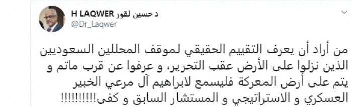 وقال في تغريدة عبر "تويتر" رصدها "المشهد العربي": "من أراد أن يعرف التقييم الحقيقي لموقف المحللين السعوديين الذين نزلوا على الأرض عقب التحرير، وعرفوا عن قرب ما تم ويتم على أرض المعركة فليسمع لإبراهيم آل مرعي الخبير العسكري والاستراتيجي والمستشار السابق وكفى".