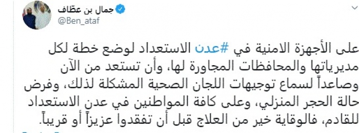 وقال في تغريدة عبر "تويتر" رصدها "المشهد العربي": "على الأجهزة الأمنية في عدن الاستعداد لوضع خطة لكل مديرياتها والمحافظات المجاورة لها، وأن تستعد من الآن وصاعداً لسماع توجيهات اللجان الصحية المشكلة لذلك، وفرض حالة الحجر المنزلي".