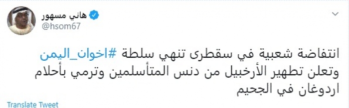 وكتب في تغريدة عبر "تويتر" رصدها "المشهد العربي": "انتفاضة شعبية في سقطرى تنهي سلطة إخوان اليمن وتعلن تطهير الأرخبيل من دنس المتأسلمين وترمي بأحلام أردوغان في الجحيم".