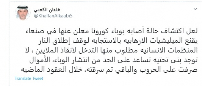 الكعبي عن وجود كورونا بصنعاء: لعل تقتنع مليشيات الحوثي بوقف إطلاق النار