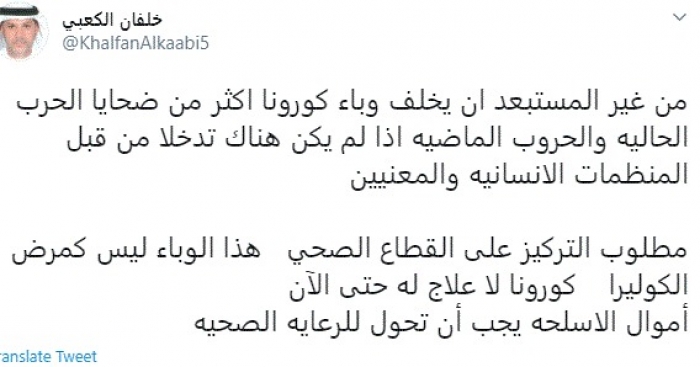 وقال في تغريدة عبر "تويتر" رصدها "المشهد العربي": "من غير المستبعد أن يخلف وباء كورونا أكثر من ضحايا الحرب الحالية والحروب الماضية إذا لم يكن هناك تدخلا من قبل المنظمات الإنسانية والمعنيين".