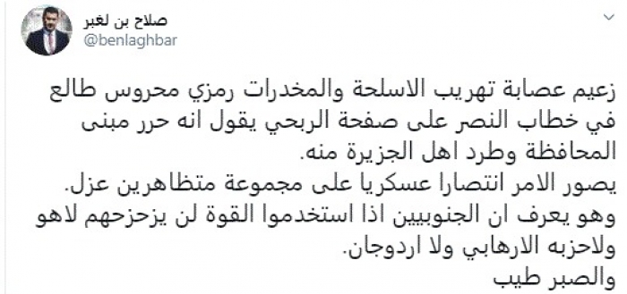 وقال في تغريدة عبر "تويتر" رصدها "المشهد العربي": "زعيم عصابة تهريب الأسلحة والمخدرات رمزي محروس طالع في خطاب النصر على صفحة الرحبي يقول أنه حرر مبنى المحافظة وطرد أهل الجزيرة منه".