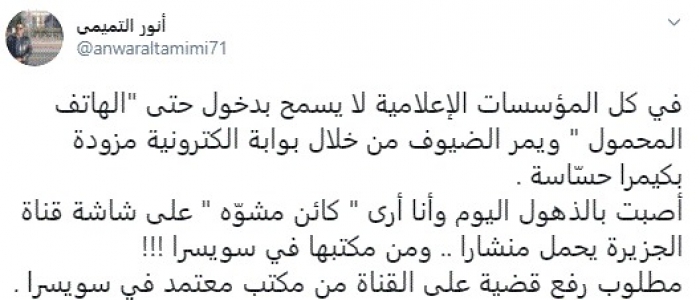 وقال في تغريدة عبر "تويتر" رصدها "المشهد العربي": "في كل المؤسسات الإعلامية لا يسمح بدخول حتى الهاتف المحمول ويمر الضيوف من خلال بوابة الكترونية مزودة بكاميرا حسّاسة".
