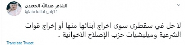 وكتب في تغريدة عبر "تويتر" رصدها "المشهد العربي": "لا حل في سقطرى سوى إخراج أبنائها منها أو إخراج قوات الشرعية وميليشيات حزب الإصلاح الإخوانية".