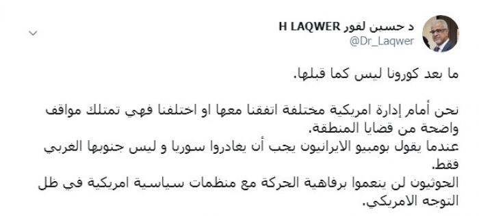وكتب لقور عبر تغريدة له على "تويتر" رصدها " المشهد العربي":"ما بعد كورونا ليس كما قبلها، نحن أمام إدارة أمريكية مختلفة اتفقنا معها أو اختلفنا فهي تمتلك مواقف واضحة من قضايا المنطقة".