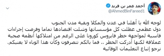 وكتب بن فريد عبر تغريدة له على "تويتر" رصدها " المشهد العربي": "لوجه الله يا أهلنا في عدن والمكلا وبقية مدن الجنوب، دول عظمى عطلت كل مؤسساتها وشلت اقتصادها تماما وفرضت إجراءات قاسية لمواجهة خطر فايروس كورونا على الرغم من امتلاكها أنظمة صحية عملاقة لكنها أدركت الخطر، فما بالكم تتصرفون وكأن هذا الوباء لا يعنيكم، نرجو اتباع التعليمات الوقائية".