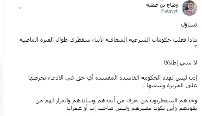 وكتب بن عطية عبر تغريدة له على "تويتر" رصدها "المشهد العربي": "تساؤل، ماذا فعلت حكومات الشرعية المتعاقبة لأبناء سقطرى طوال الفترة الماضية ؟ لا شيء إطلاقا".